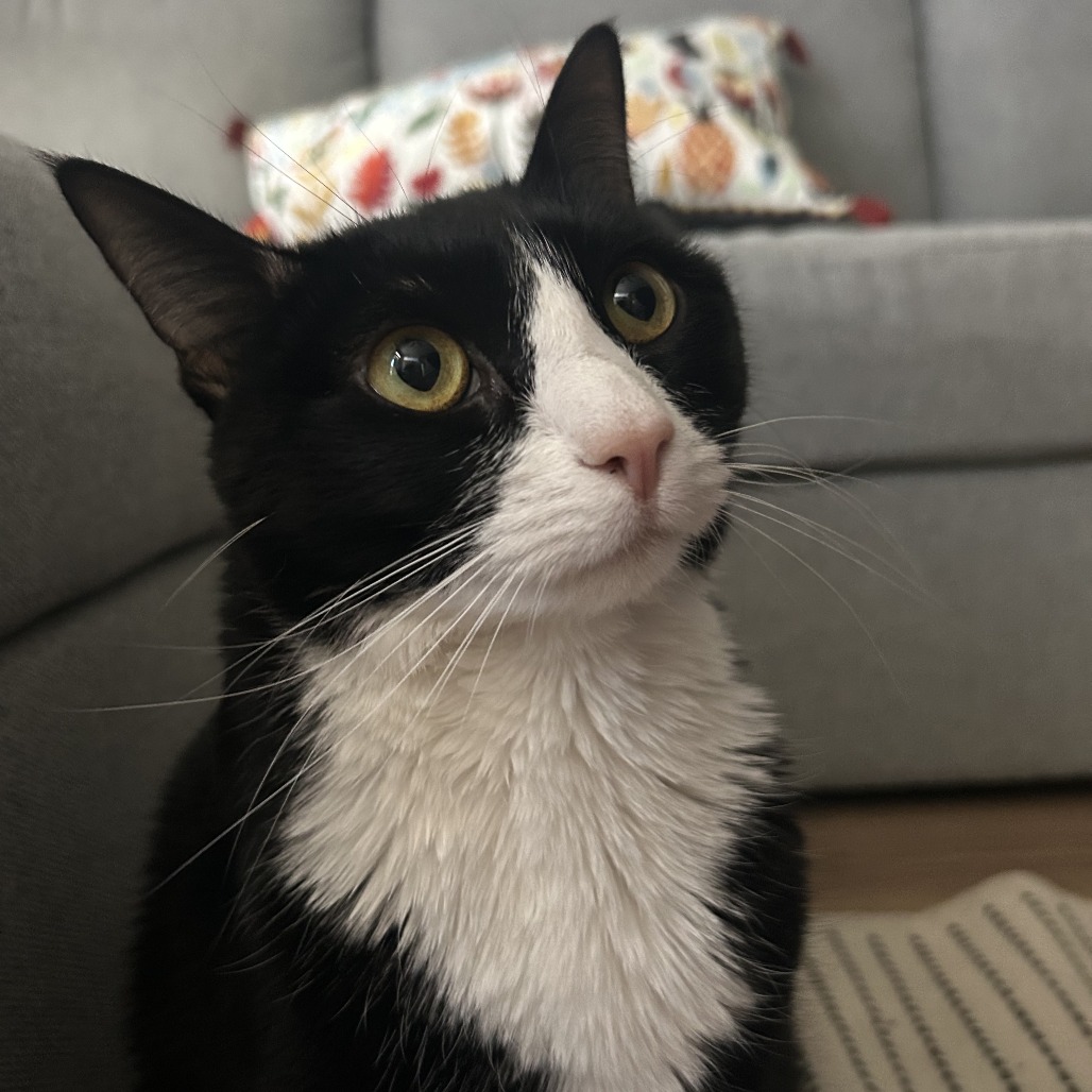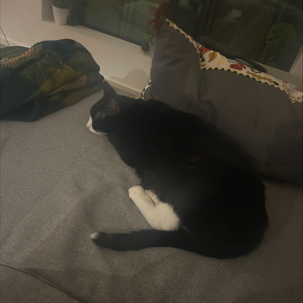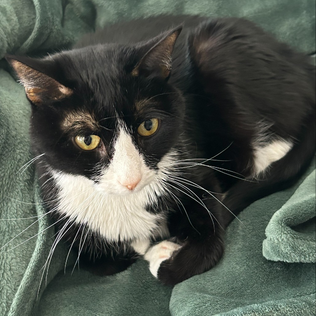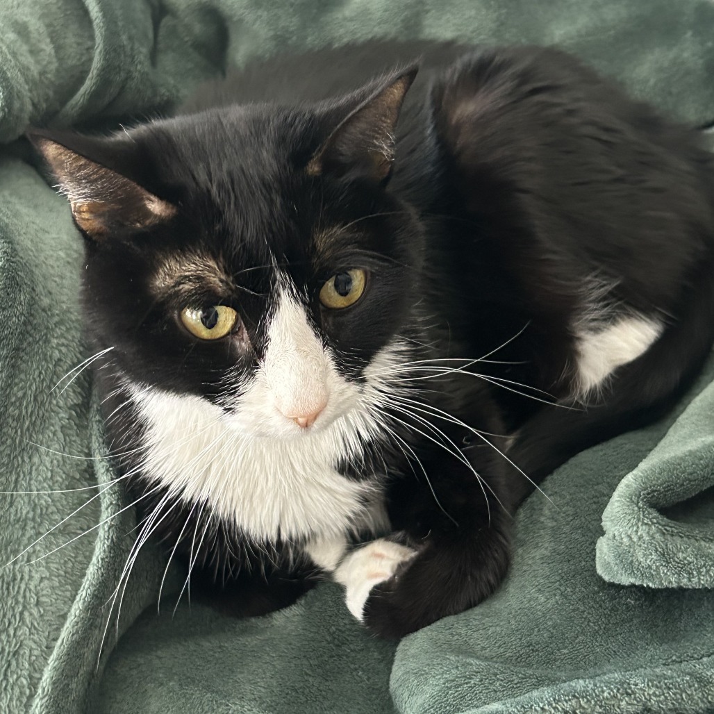 Sox is a lovely girl with an easygoing presence and a nice balance of independence and affection. She’s a self‑assured couch potato who enjoys having her own space but is happy to accept attention when the mood strikes. Gentle pets, treats, and quiet companionship are all right up her alley.