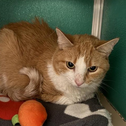 Frida is a lovely orange‑and‑white tabby whose gentle nature makes her an easy cat to adore. She gets along beautifully with other cats, making her a wonderful fit for a home that already has feline companions.